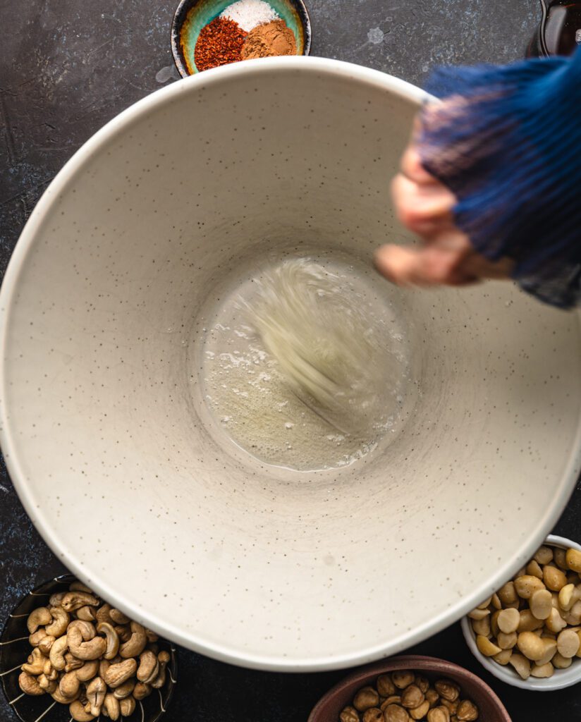 In a separate bowl, whisk the egg white vigorously until frothy. This helps coat the nuts evenly.