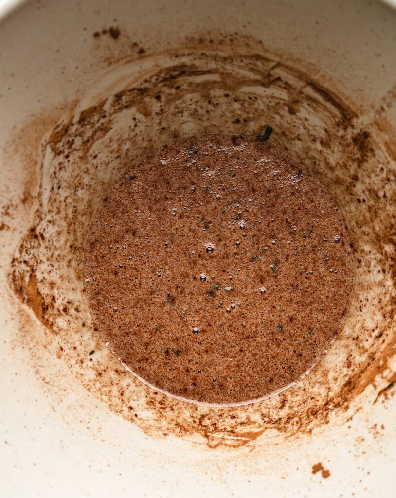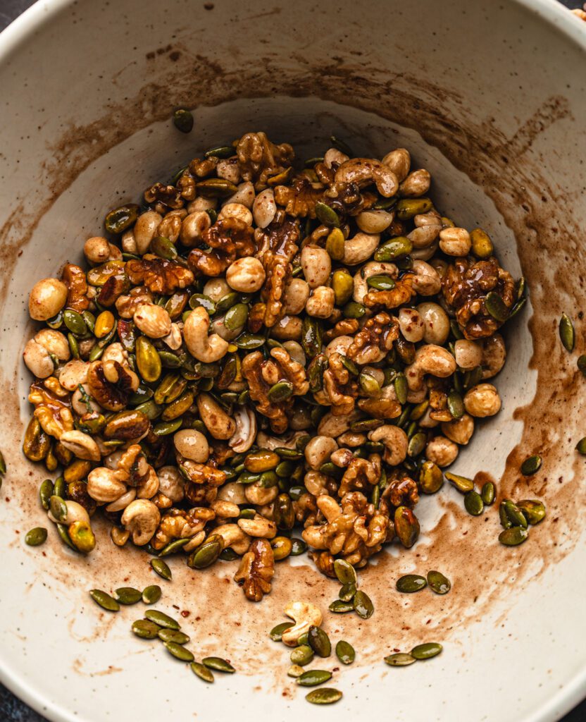 Pour the egg white over the nuts. Add the maple syrup, spices, herbs, and salt. Stir until every nut is coated in the glossy spiced mixture.