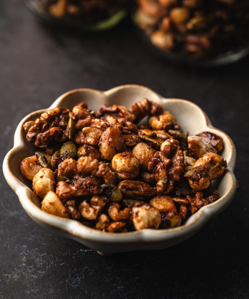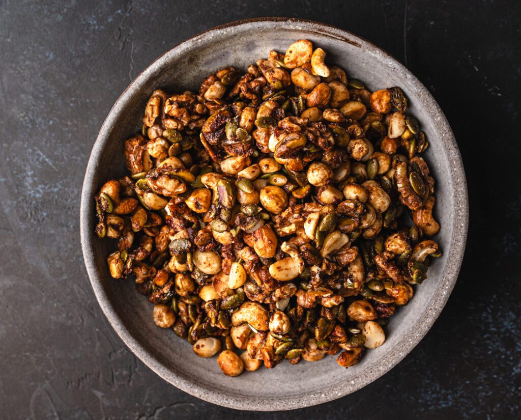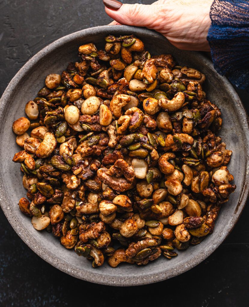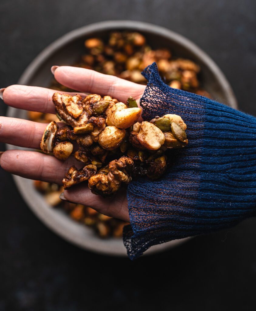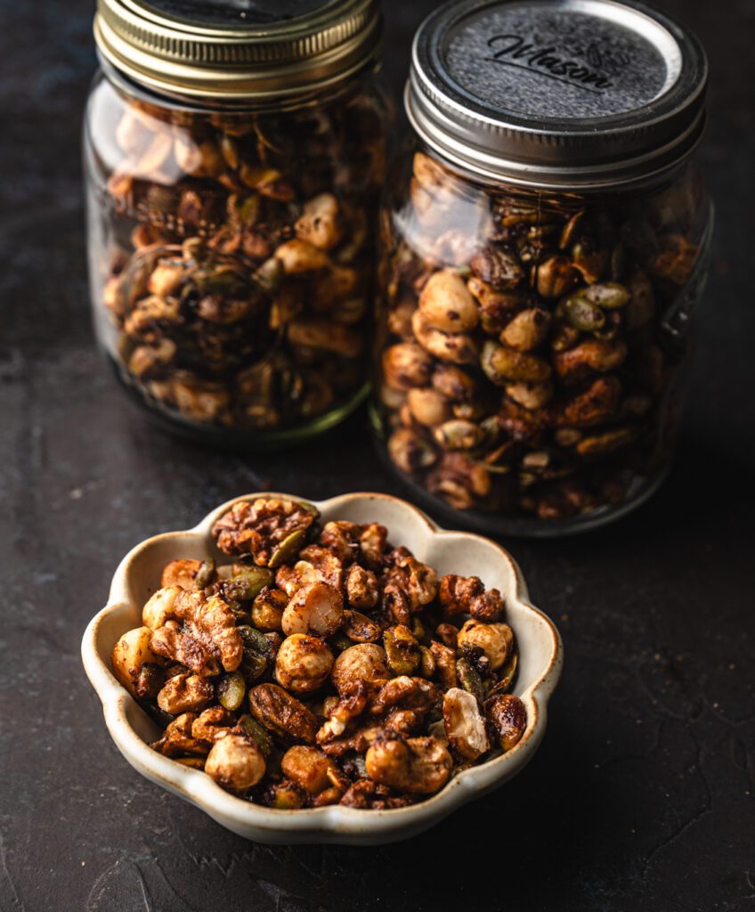 Yes! Nuts are incredibly nutrient dense and provide protein, healthy fats, minerals, and fibre. They help keep you full, energize your day, support hormone balance, and make a wonderful alternative to heavily processed snacks. This healthy spiced nuts recipe uses a bunch of nuts to create a mix of textures and nutritional benefits. You could totally swap out any nuts for your preferred ones, and they are still going to be healthy!