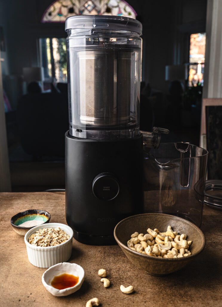 Start by preparing your plant-based milk using the Nama Milk Maker. Add the cashews, oats, date, vanilla, and salt, then process until smooth. You’ll notice the milk becoming creamy while the pulp separates—this pulp is full of fibre and will be used in the cookies, so set it aside!