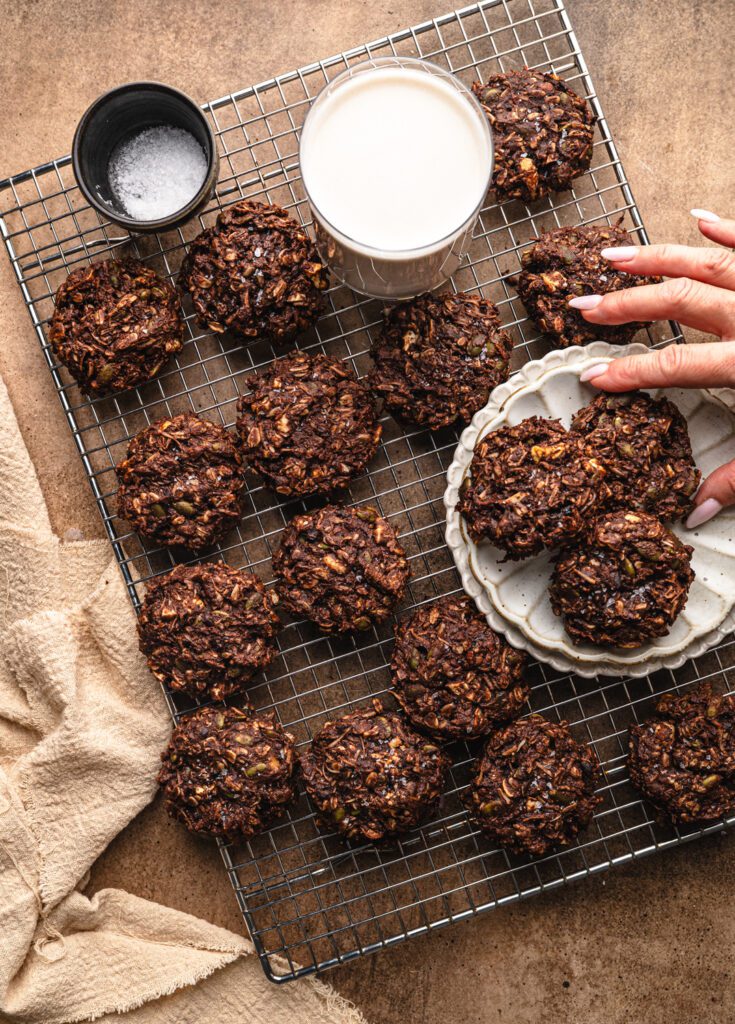 Place the cookies in the oven and bake for 15 to 17 minutes. You’ll know they’re ready when the edges look set, and you can smell the cacao becoming rich and fragrant throughout your kitchen.