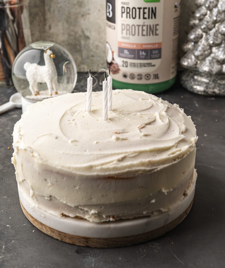 For the past 3 years, I’ve been making my own birthday cake, and this year we are going all white! I wanted high in protein, little frosting and fluffy, yummy deliciousness. I achieved all the above. I used my favourite protein powder, Botanica Health Vanilla Protein Powder, for the boost of protein, but let’s not forget the cup of Greek yogurt and 3 eggs too. I will be coming back to this cake forevermore when a celebration needs to be had.