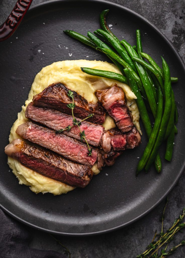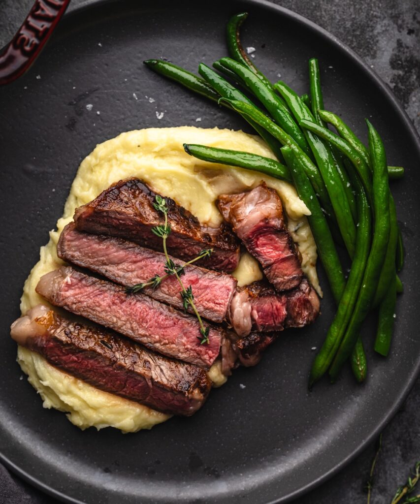 Letting your steak be the main attraction is definitely what it’s all about; HOWEVER, your pan-seared ribeye with some cheesy mashed potatoes and you’ve got a flavour bomb of a plate. Roasted vegetables, a crisp green salad, mashed potatoes, or sautéed greens would also be totally acceptable side dishes!