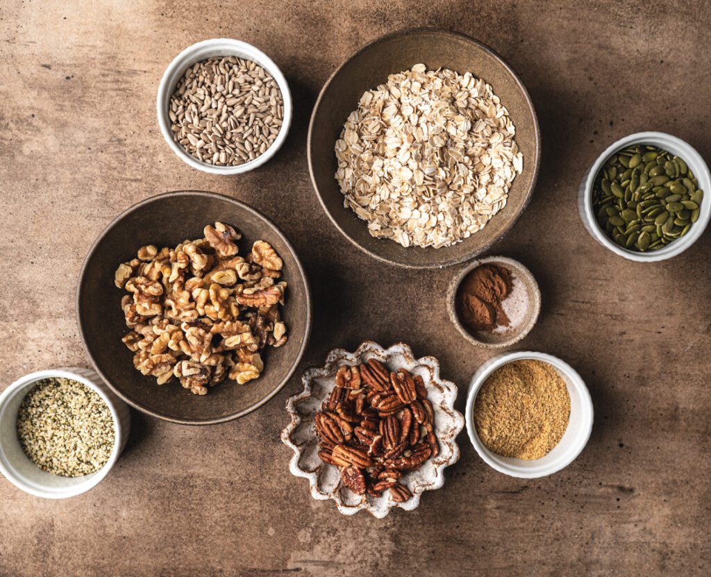 This banana bread granola recipe is filled with nutrient-rich nuts, hearty oats, and wholesome seeds to create a deeply flavoured, crunchy breakfast staple. Here’s what you’ll need!