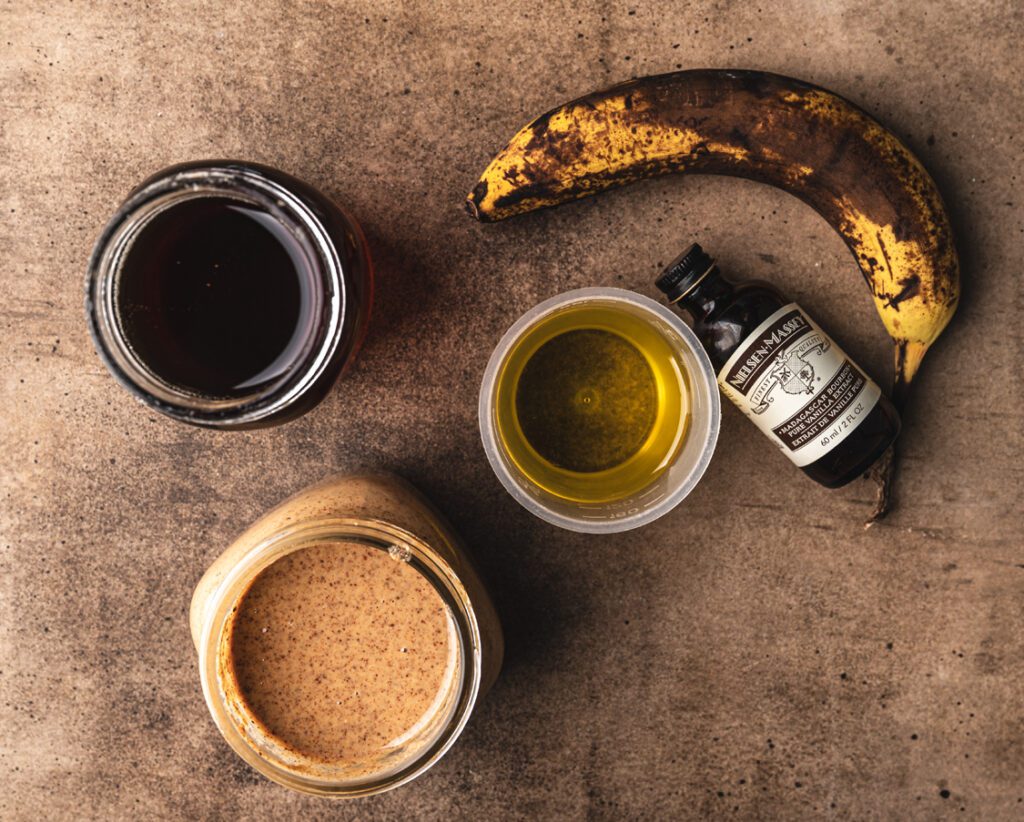 Mash the ripe banana into a small pot. Add the olive oil, almond butter, maple syrup, and vanilla. Warm over medium-low heat, stirring until smooth and slightly fluid.