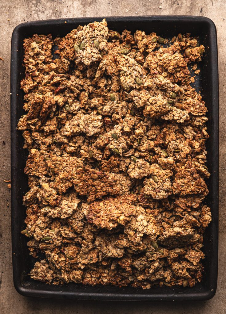 How do I make granola clumpy? Press the mixture firmly onto the pan, bake without stirring, and let it cool fully before breaking apart.
