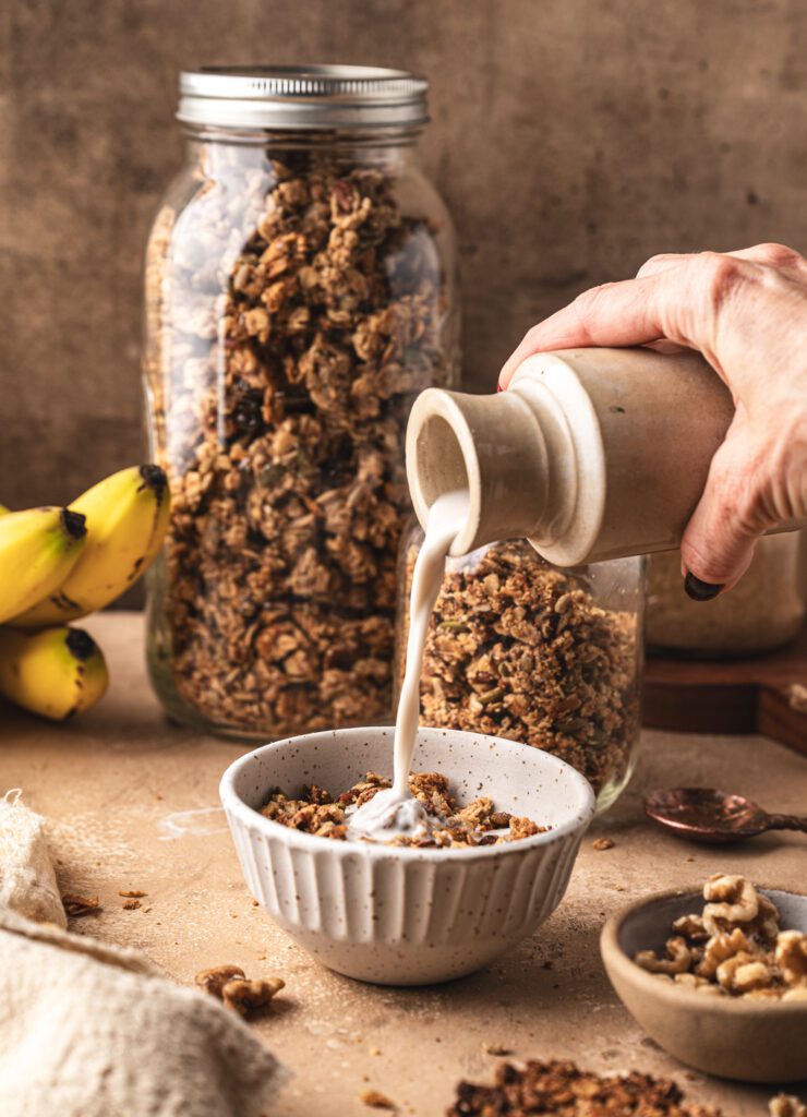 This is the best banana bread granola for so many reasons. It’s naturally gluten-free, deeply flavorful, and packed with nuts and seeds that make it hearty and satisfying. The combination of ripe banana, maple syrup, and cinnamon tastes like a slice of warm banana bread but in a crunchy, golden form. Eat this with your favourite milk and you’ll be sipping every last drop of it after all the crunching because my goodness, this granola is gooood. It’s nourishing, affordable to make in large batches, and far fresher than anything you can buy. It makes a wonderful holiday gift and is a lot of fun to make!